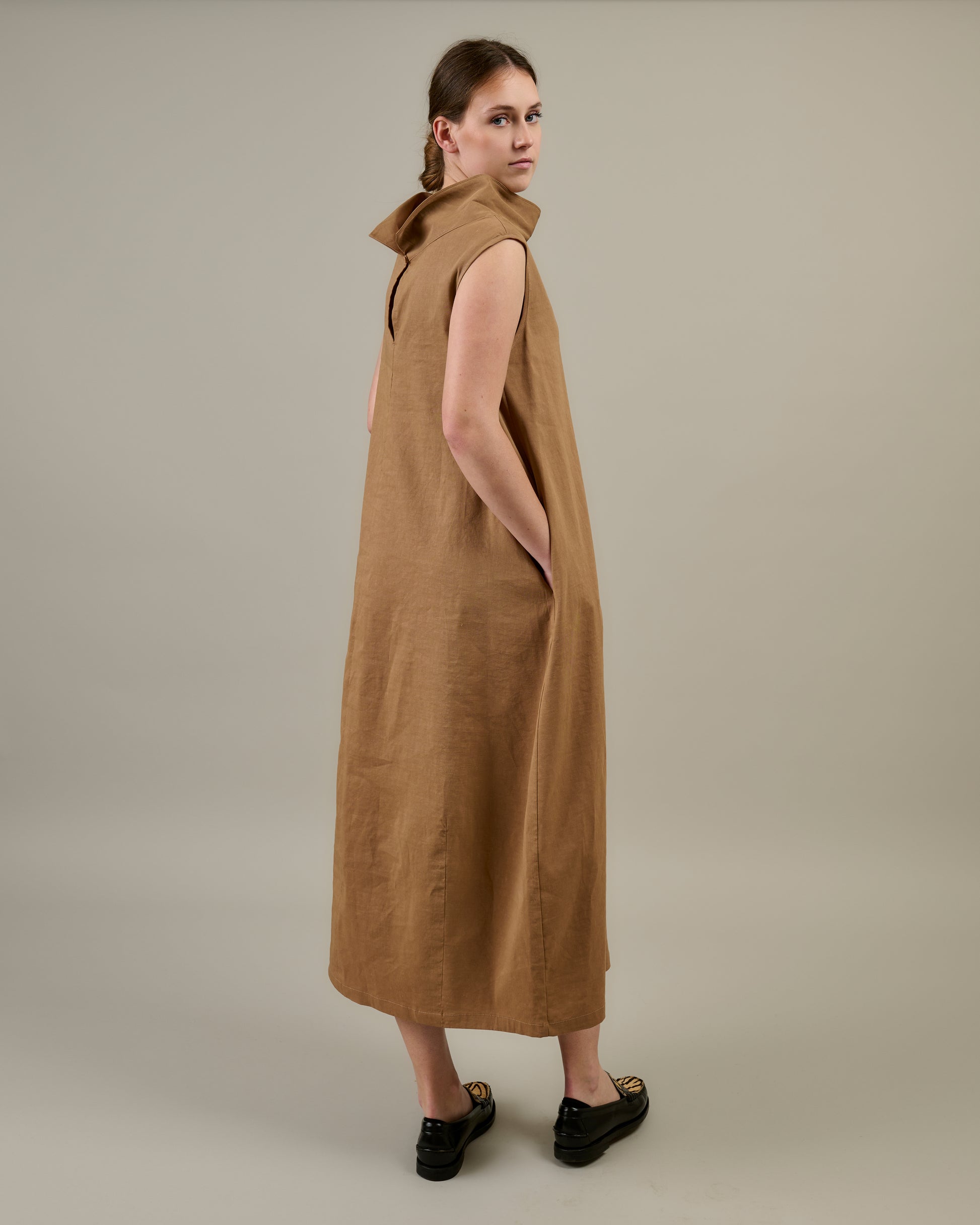 Abito lungo dalla vestibilità over con scollo a barca e spacco frontale che dà movimento mentre il colletto reverse dona uno stile ricercato.