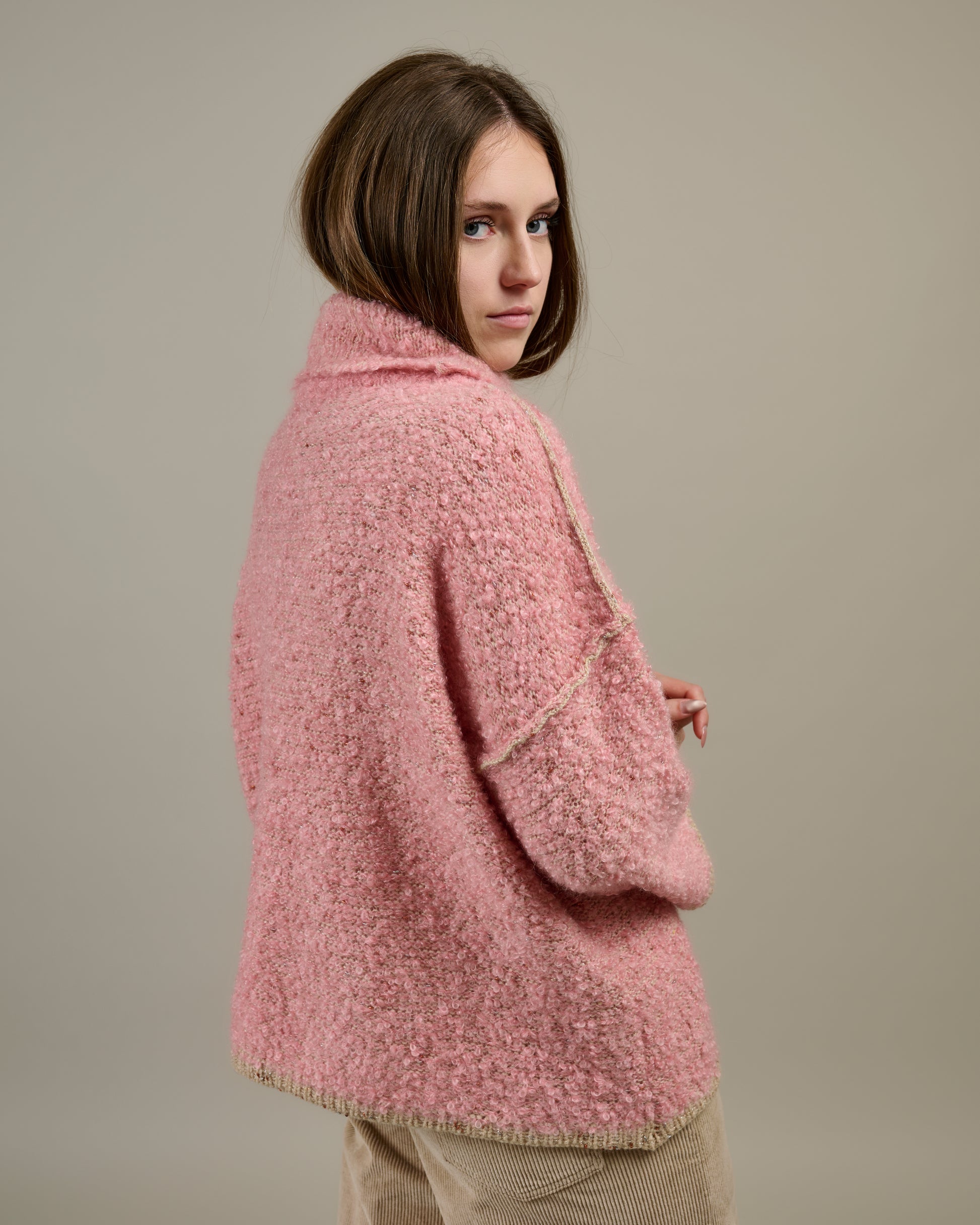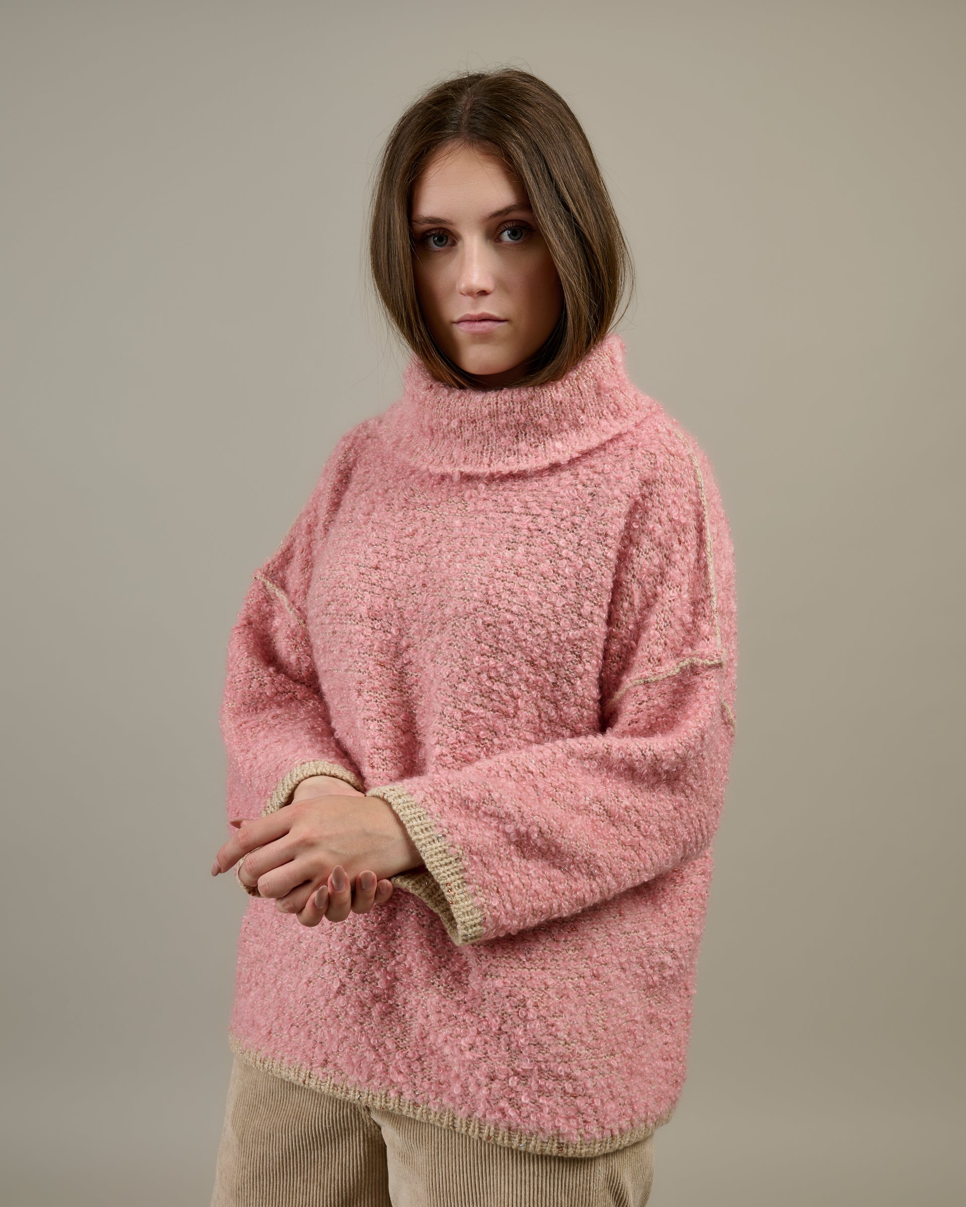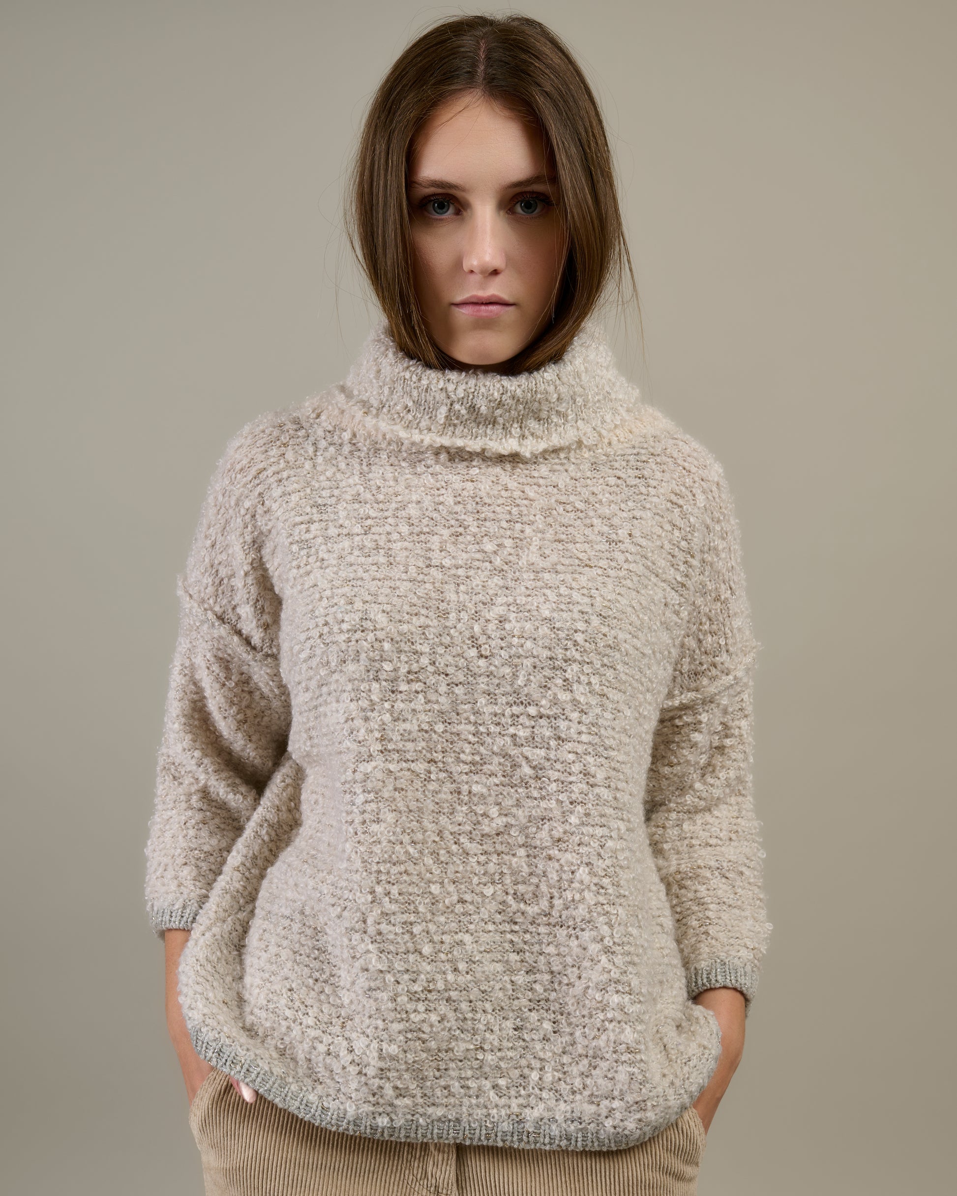 Maglia in bouclé in Mohair e Cashmere dal volume leggero grazie all'intreccio con fibre di seta. Il collo a cratere rifinisce il capo caratterizzato da cuciture in rilievo a contrasto in Lurex di Merino.