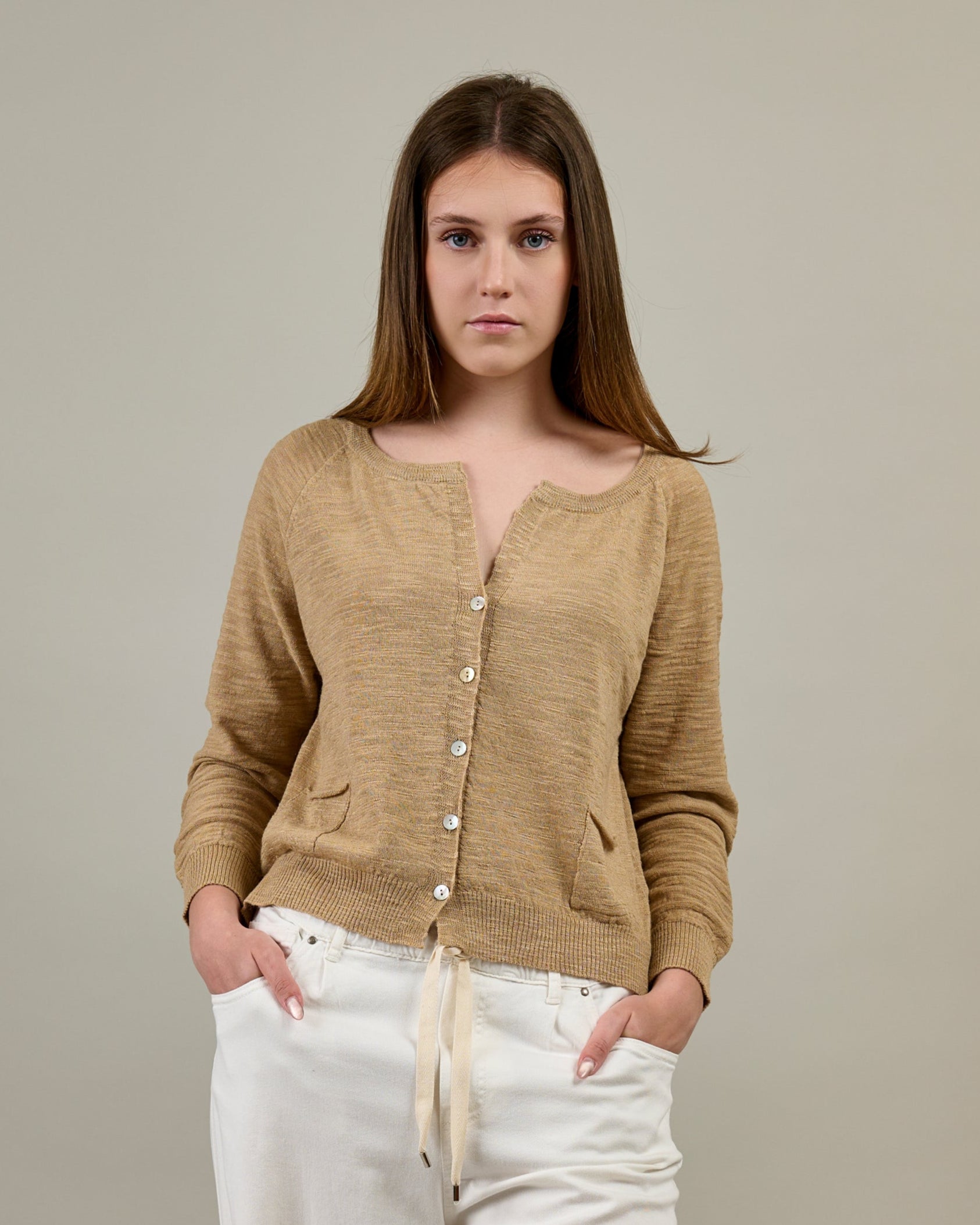 Cardigan corto girocollo con tasche a toppa realizzato in maglia rasata effetto irregolare ed impreziosito da bottoni in madreperla.